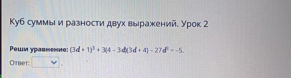 Реши уравнение: (3d+ 1)^3 + 3(4 – 3d)(3d + 4) - 27d^3= -5. Ответ: