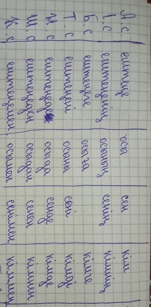 3-тапсырма. Есімдіктерді септік жалғауларымен түрлендіріп, кестені толтырыңдар. Не с Есімдіктер Септіктер әлдекім кім өзі ештеңе осы сен 2 Атау Ілік Барыс Табыс Жатыс Шығыс Көмектес