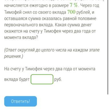 Тимофей положил в банк некоторую сумму денег. За время хранения вклада в банке процент по нему начисляется ежегодно в размере 7%. Через год Тимофей снял со своего вклада 700 рублей, и оставшаяся сумма оказалась равной половине первоначального вклада. Какая сумма денег окажется на счету у Тимофея через два года от момента вклада?