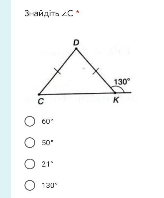 Так как угол К смежный и равен 130 градусов, то угол DKC равен 180-130=50 градусов. Треугольник DCK равнобедренный так как CD=DK, тогда угол С равен углу DKC, т.е 50 градусов.