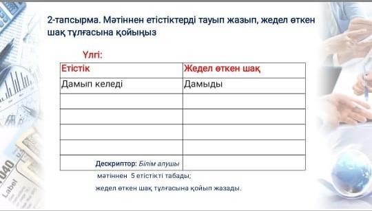 Мәтіннен етістіктерді тауып жазып, жедел өткен шақ тұлғасына қойыңыз Етістік Жедел өткен шақ Дамып келеді Дамыды Пайда болып жатыр Алып береді