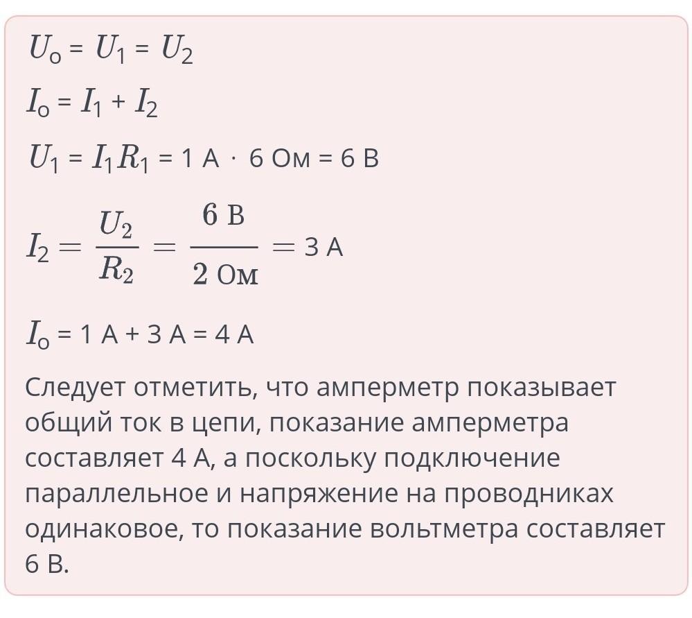 Определи показания амперметра и вольтметра, если известно, что через проводник R1 протекает ток 1 А. Сопротивлением амперметра и соединительных проводов можно пренебречь.