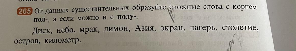 Полдиска, полудиск, полнеба, полумрак, пол-лимона, пол-Азии, пол-экрана, полуэкран, пол-лагеря, полстолетия, пол-острова, полуостров, полкилометра.