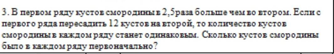 пусть изначально во втором ряду было х кустов, тогда в первом 2,5х После пересадки получилось в первом ряду 2,5х-12,а во втором ряду х+12 Составим уравнение