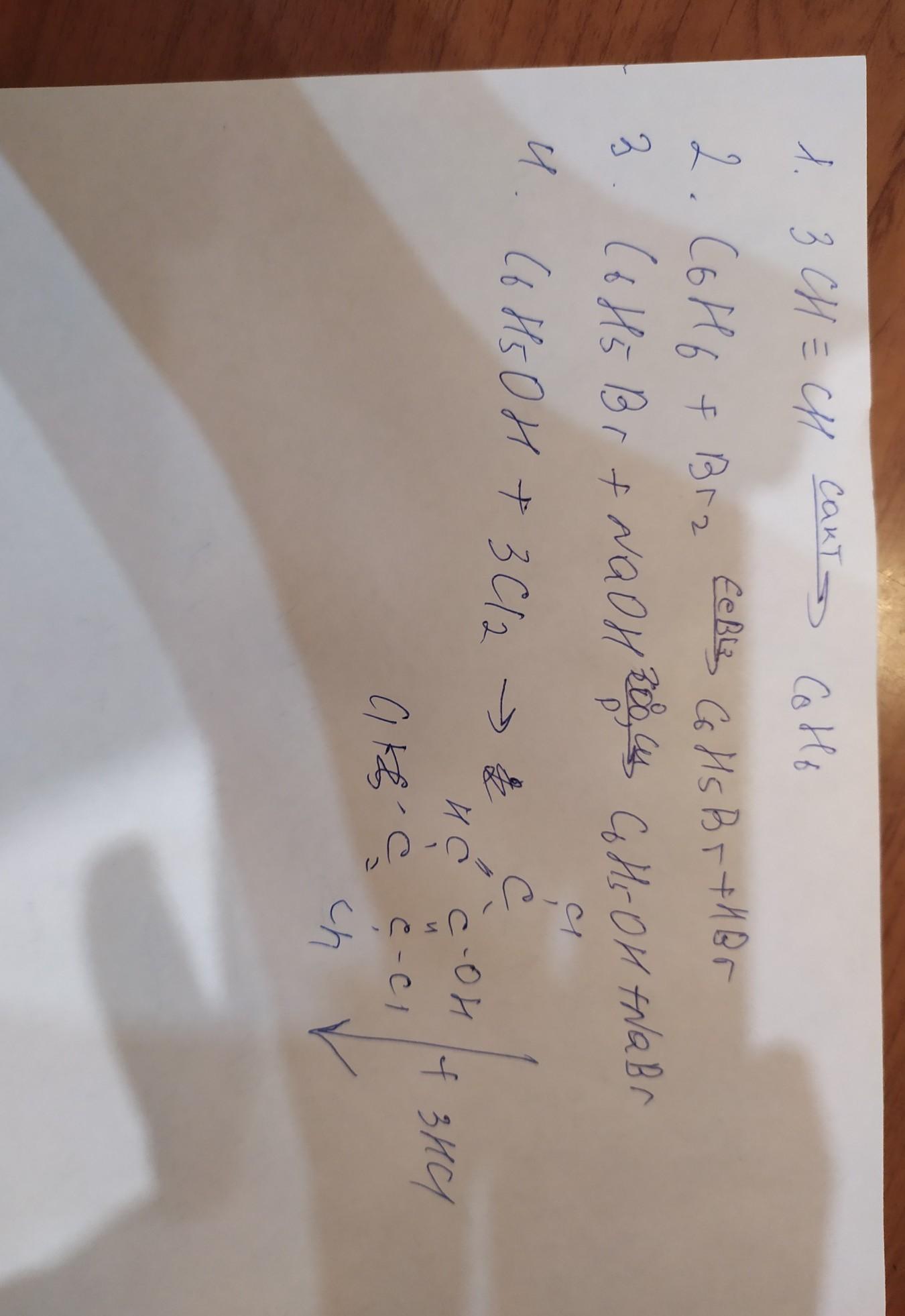 ПОМОГИТЕ ПО ХИМИИ. Осуществите схему превращений. Укажите условия протекания реакций. Ацетилен-бензол-бромбензол-фенол-2.4.6-трихлорфенол.