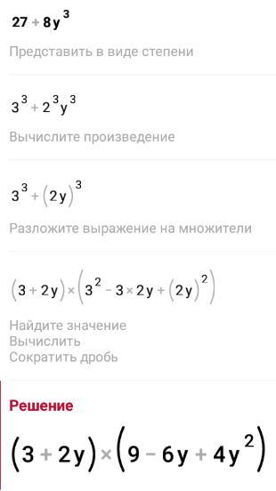27+8у³=3³+(2у)³=(3+2у)(9-6у+4у²).