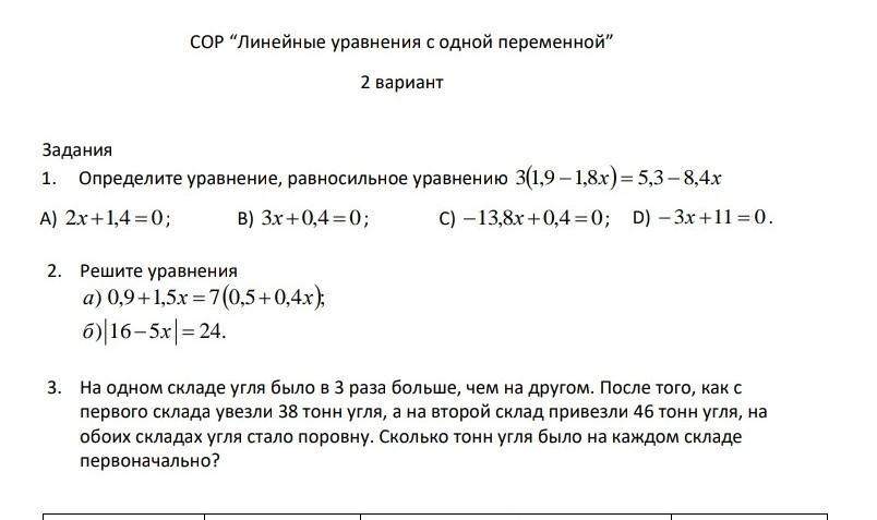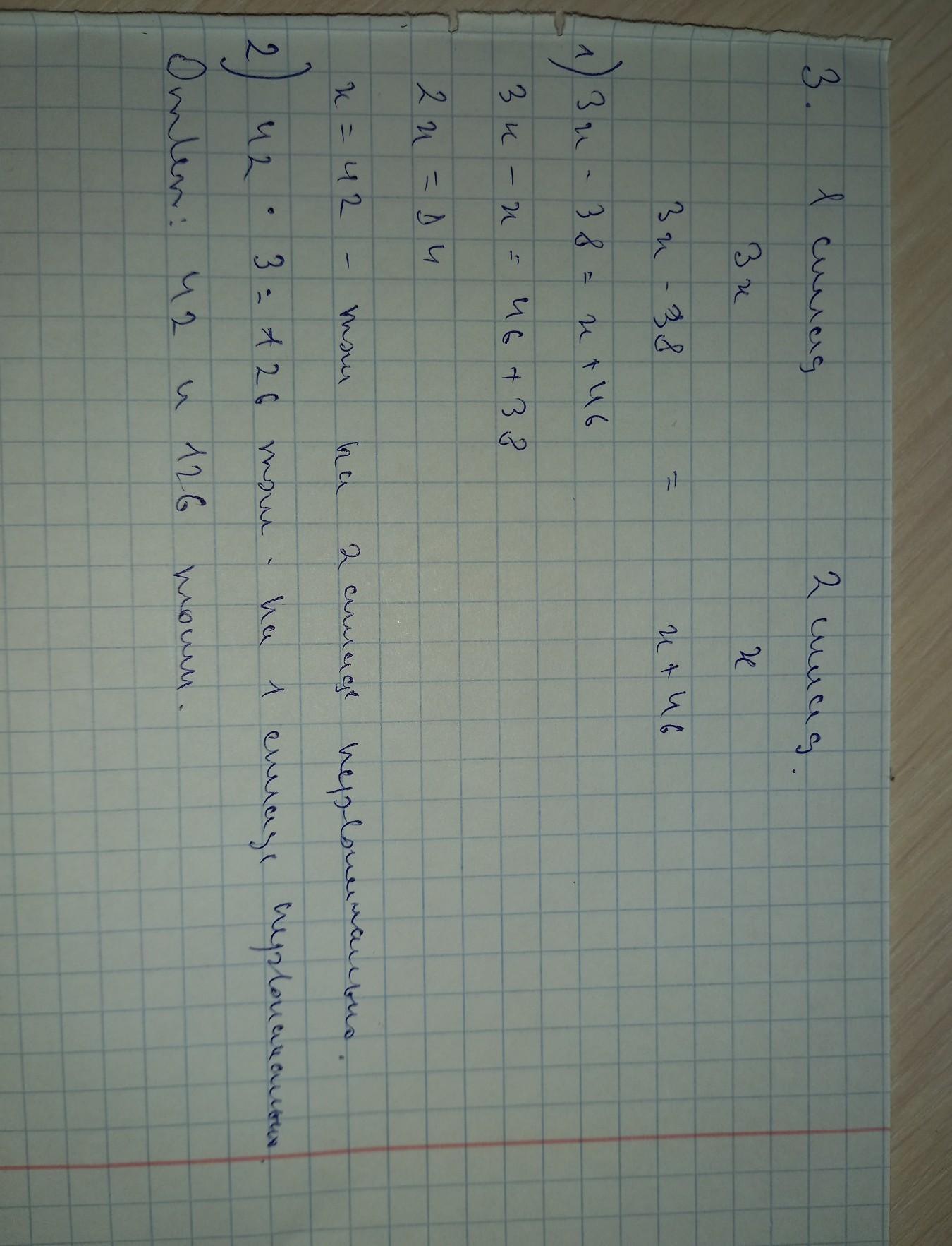 3) Пусть на втором складе было - х т угля, тогда на втором складе 3х т угля ,когда с первого увезли 38 т на нем стало 3х- 38, а на второй привезли 46 т на нем стало х+ 46 т. Составим уравнение: