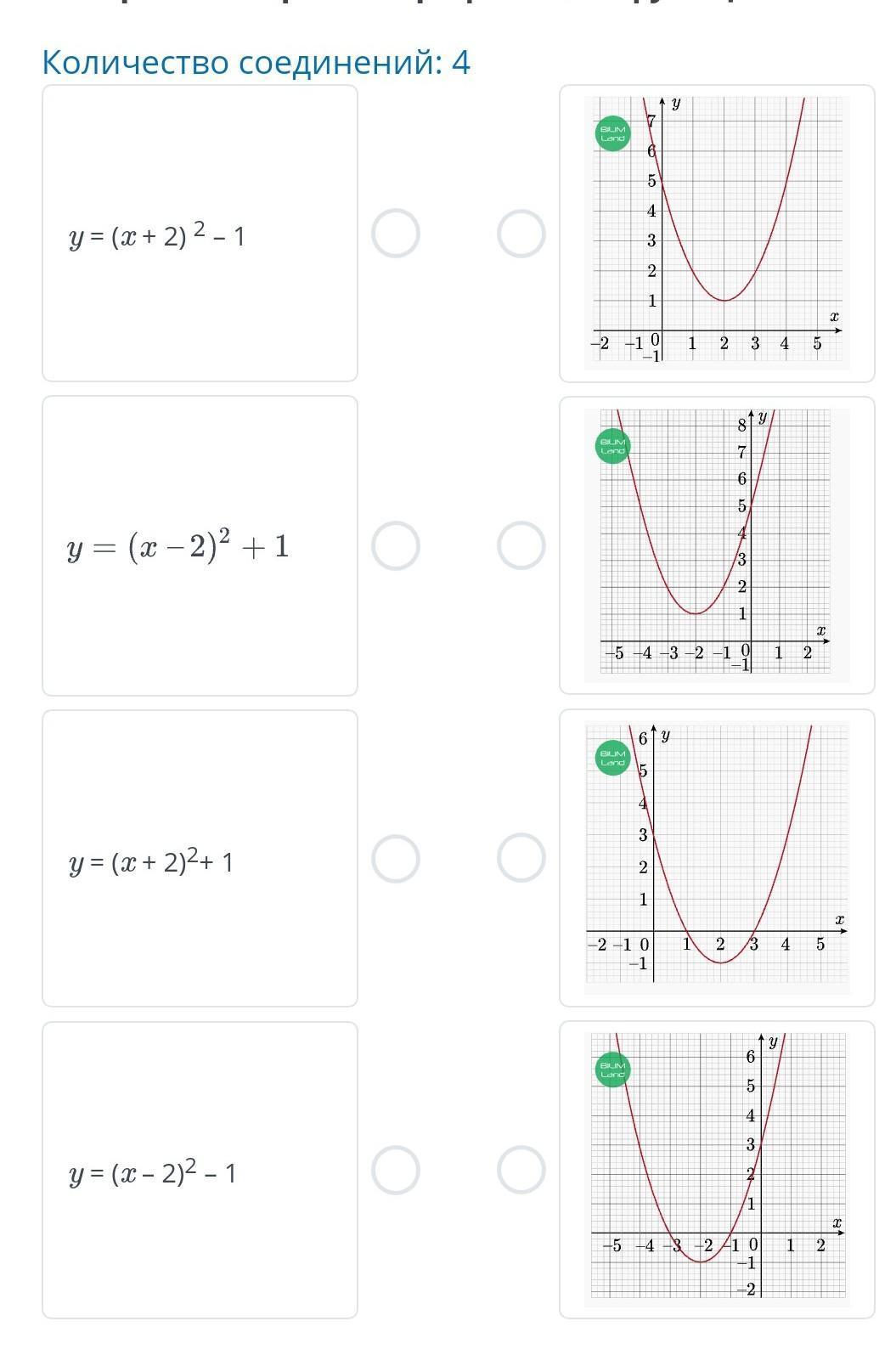 Сопоставь уравнение функции с рисунком, на котором изображен график этой функции. Количество соединений: 4.