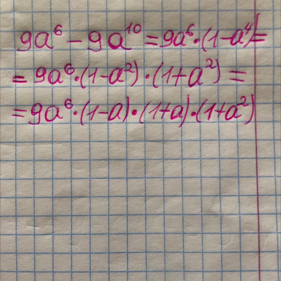9a^6-9a^10=9а^6(1-a^4)=9а^6(1-a^2)(1+a^2)