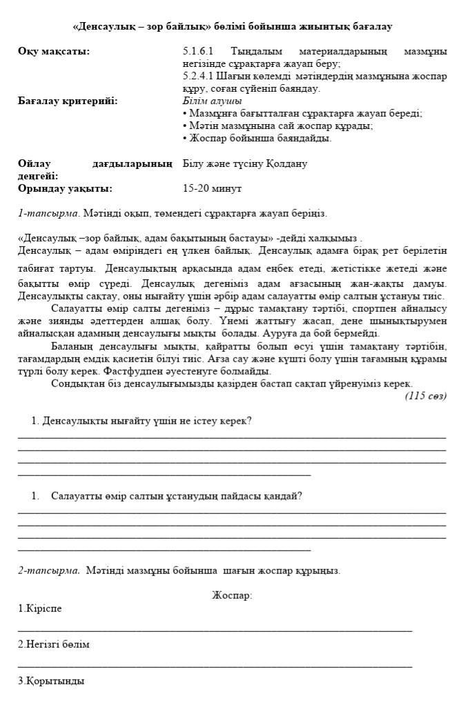 1.Денсаулықты нығайту үшін пайдалы тағамдар жеп спортпен шұғылданып,зиянды әрекеттерден алшақ болу
