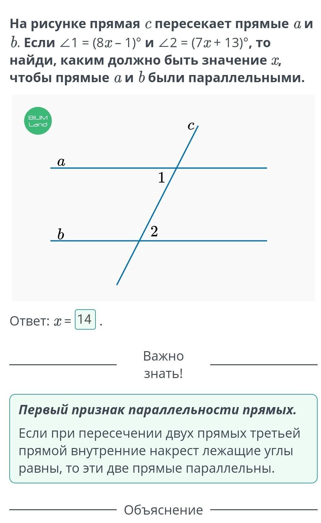 На рисунке прямая c пересекает прямые a и b. Если ∠1 = (8x – 1)° и ∠2 = (7x + 13)°, то найди, каким должно быть значение x, чтобы прямые a и b были параллельными