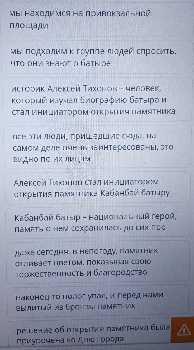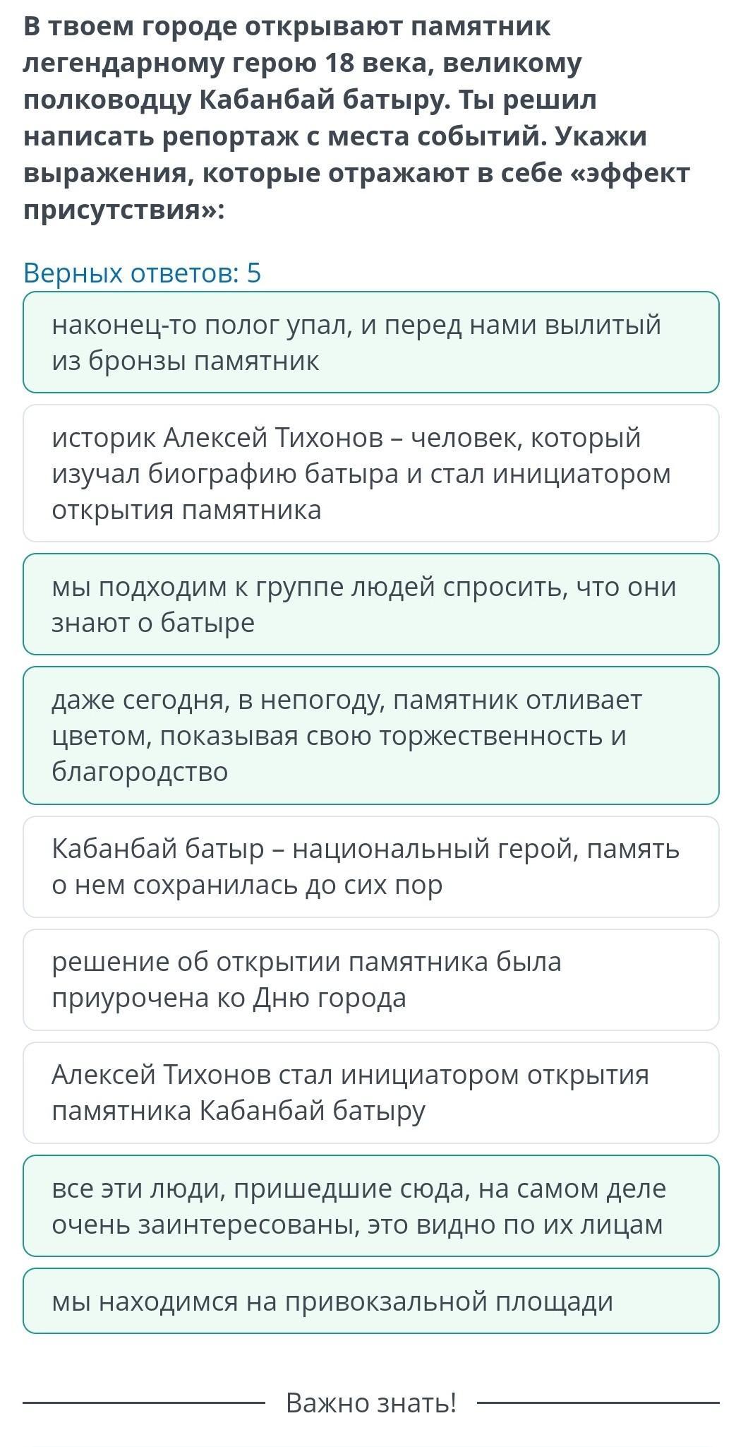 В твоем городе открывают памятник легендарному герою 18 века, великому полководцу Кабанбай батыру. Ты решил написать репортаж с места событий. Укажи выражения, которые отражают в себе «эффект присутствия»: Верных ответов: 5