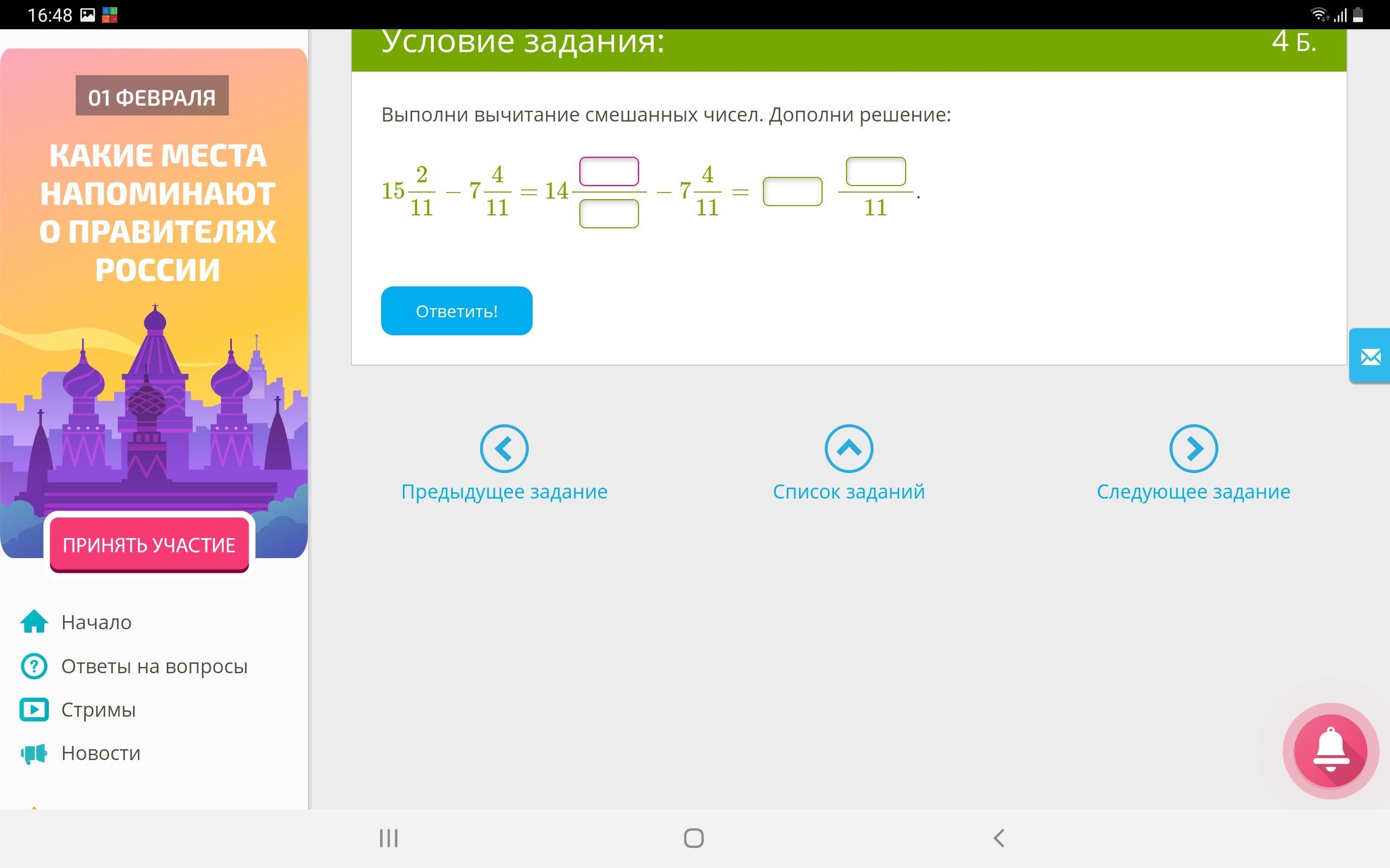 У тебя в первом 15(2/11)=14 (?/?) Проще всего делать это с одинаковыми знаменателями, поэтому оставим 11. Что бы из 15ти перевести в 14, надо что бы числитель был больше единицы, так мы в числителе получаем (11+2)/11