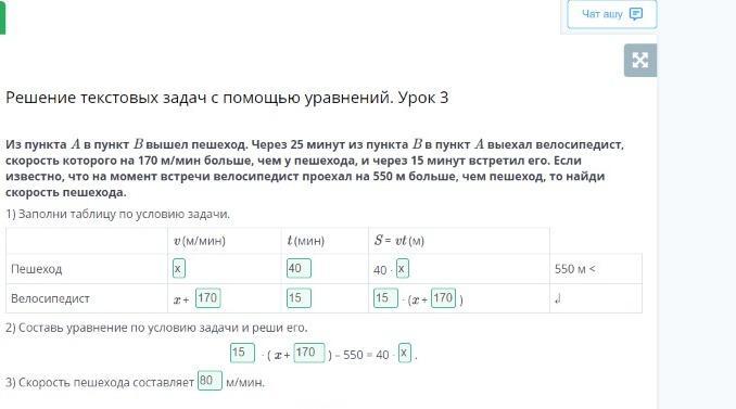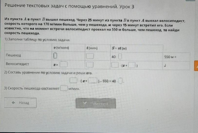 Решение текстовых задач с помощью уравнений. Урок 3 В Из пункта A пункт В вышел пешеход. Через 25 минут из пункта Bв пункт А выехал велосипедист, скорость которого на 170 м/мин больше, чем у пешехода, и через 15 минут встретил его. Если известно, что на момент встречи велосипедист проехал на 550 м больше, чем пешеход, то найди скорость пешехода. 1) Заполни таблицу по условию задачи. у (м/мин) t(мин) S = vt (м) Пешеход 550 м< 400 Велосипедист Д Т - (х+ 2) Составь уравнение по условию задачи и реши его. (х+ ) - 550 = 40 - 07. ) 3) Скорость пешехода составляет м/мин. - Назад В Проверить