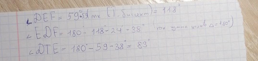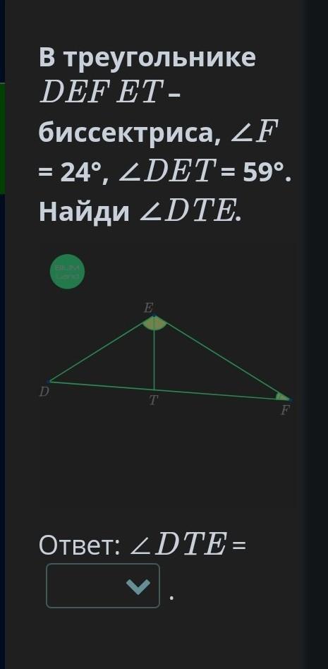 В треугольнике DEF. ET- биссектриса, F =24° , DET=59° . Найди DTE