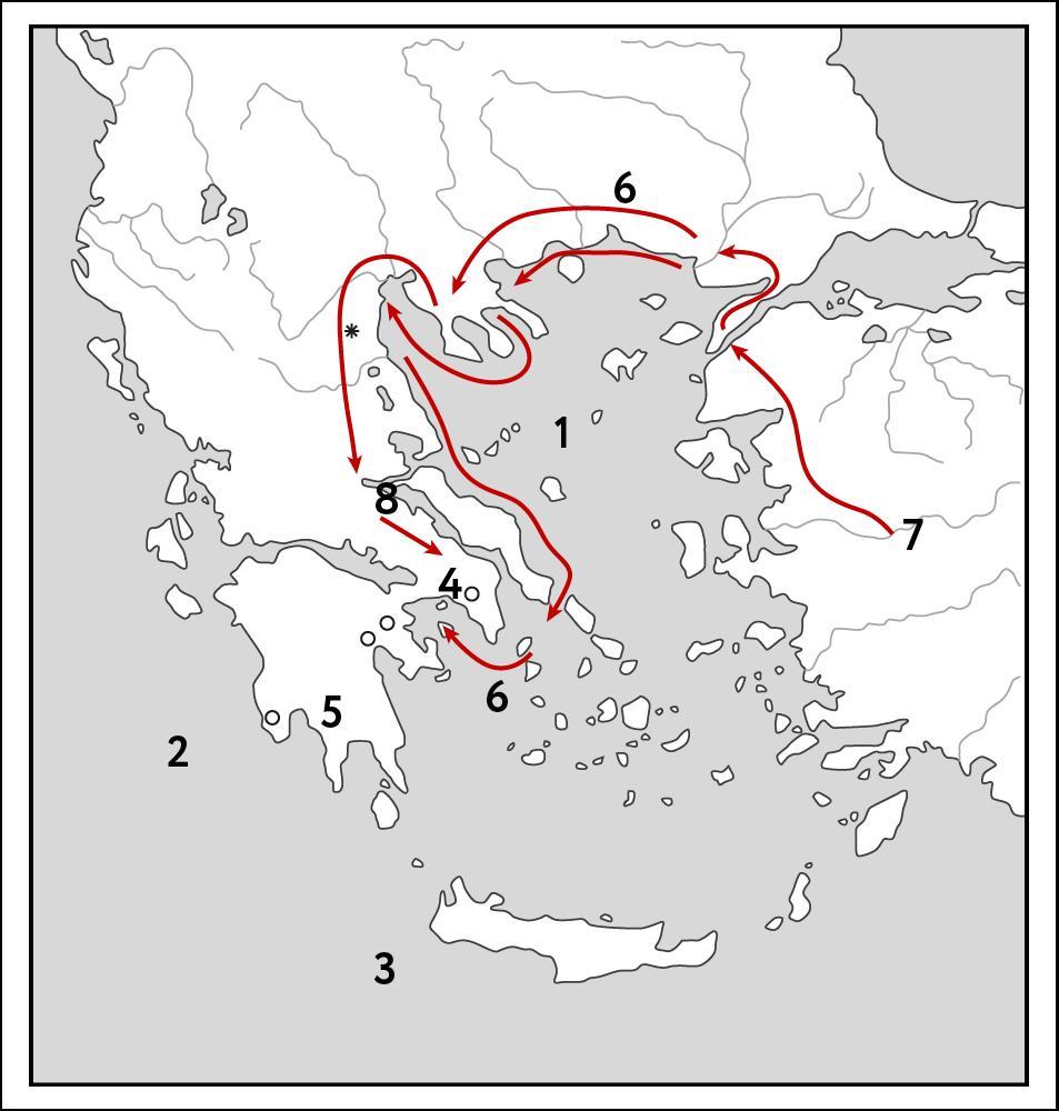 Рассмотрите контурную карту и выполните задание. Запишите название греческого полиса, обозначенного на карте цифрой «4», в именительном падеже, без кавычек и знаков препинания. Образец ответа: Коринф