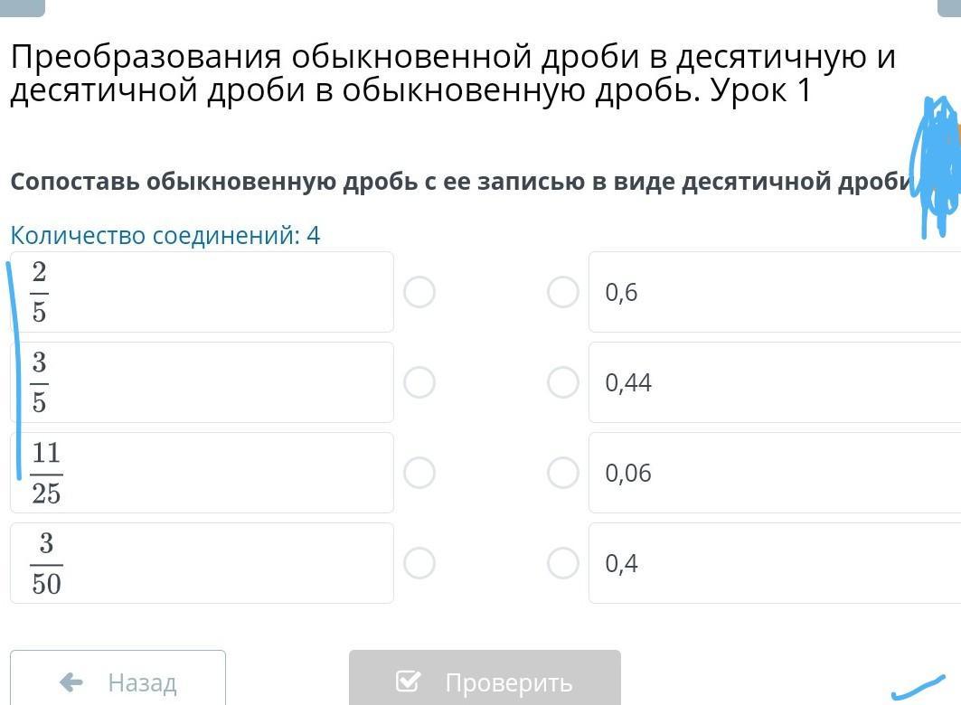 Сопоставь обыкновенную дробь с ее записью в виде десятичной дроби.