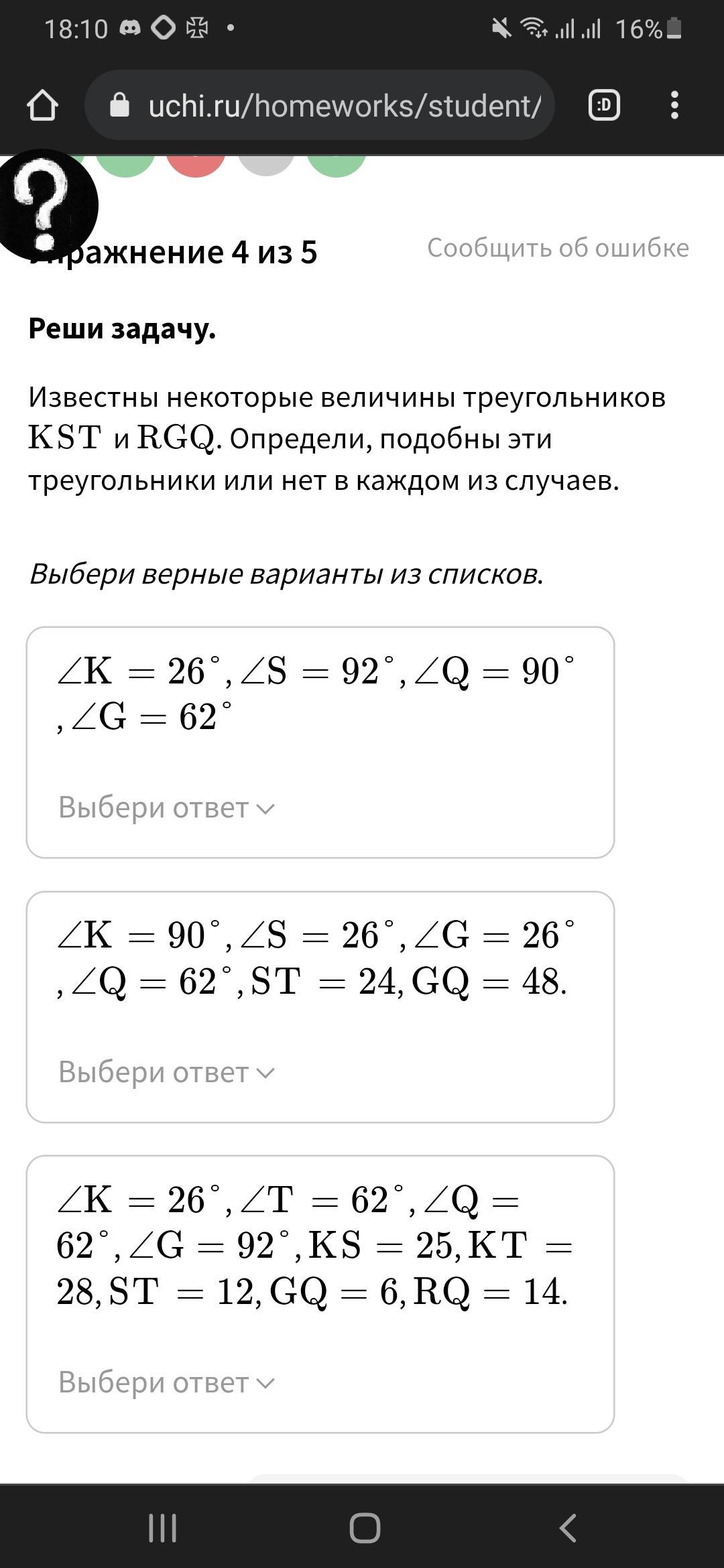 ΔRGQ - ∠G=92°, ∠Q=62° ⇒ ∠R=180-(92+62)=26°.