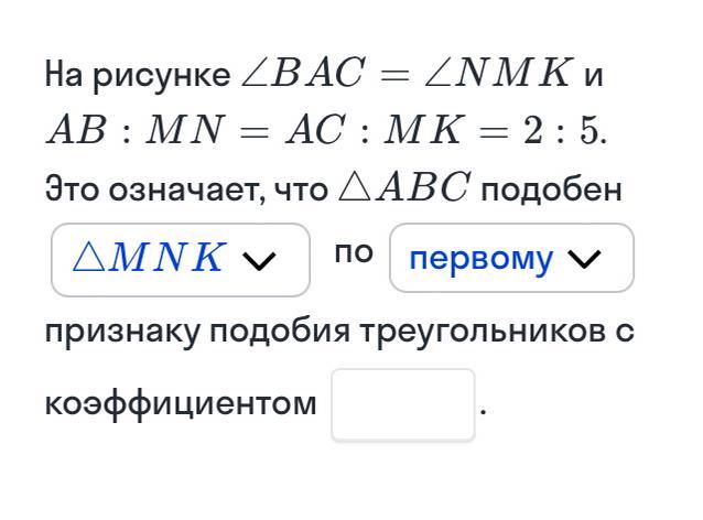 ΔABC подобен ΔNMK по первому признаку с коэффициентом подобия k=5:2=2,5.