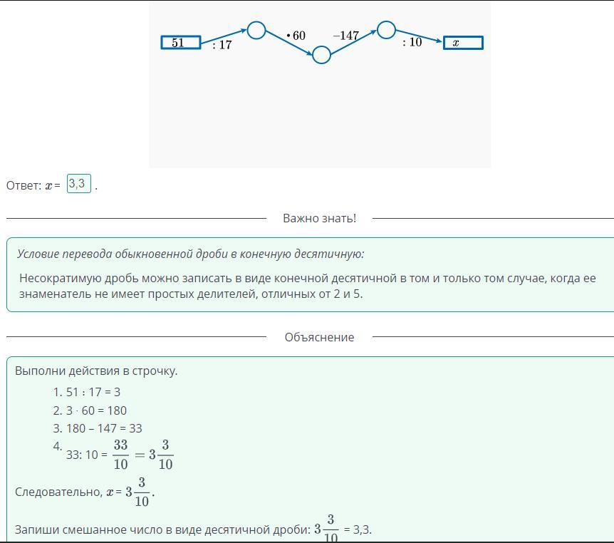 Преобразования обыкновенной дроби в десятичную и десятичной дроби в обыкновенную дробь. Урок Определи значение х. Ответ запиши в виде десятичной дроби. 51:17 ×60 -147 :10 × Ответ: x=