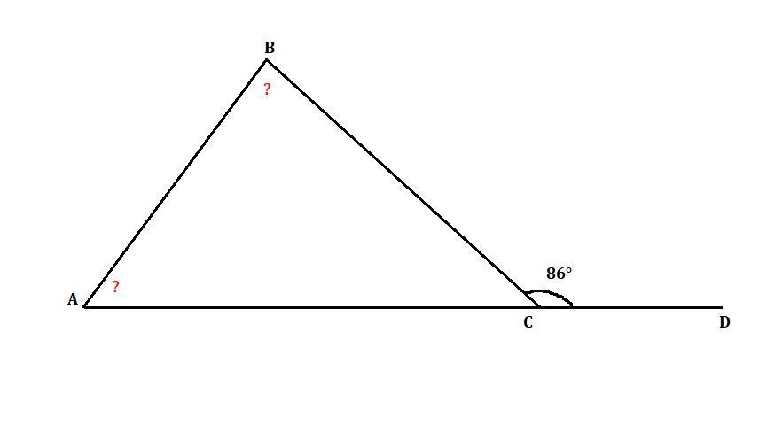 Зовнішній кут при вершині С кут АВС дорівнює 86°,то сума внутрішніх кутів А і В цього трикутника дорівнює?