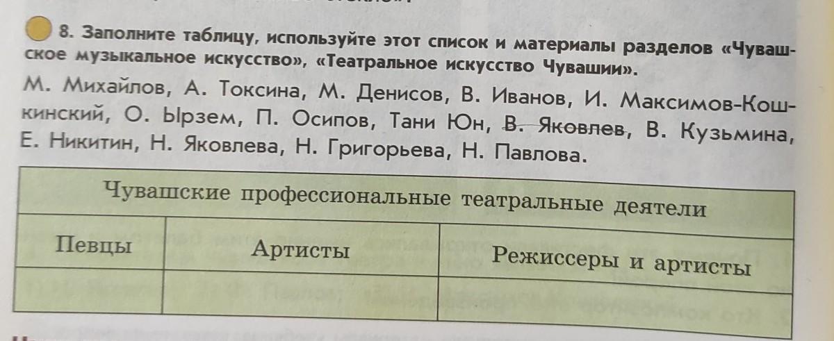 8. Заполните табинцу, используйте этот список м материалы разделов ское музыкальное искусство», «Театральное искусство Чунашиии,