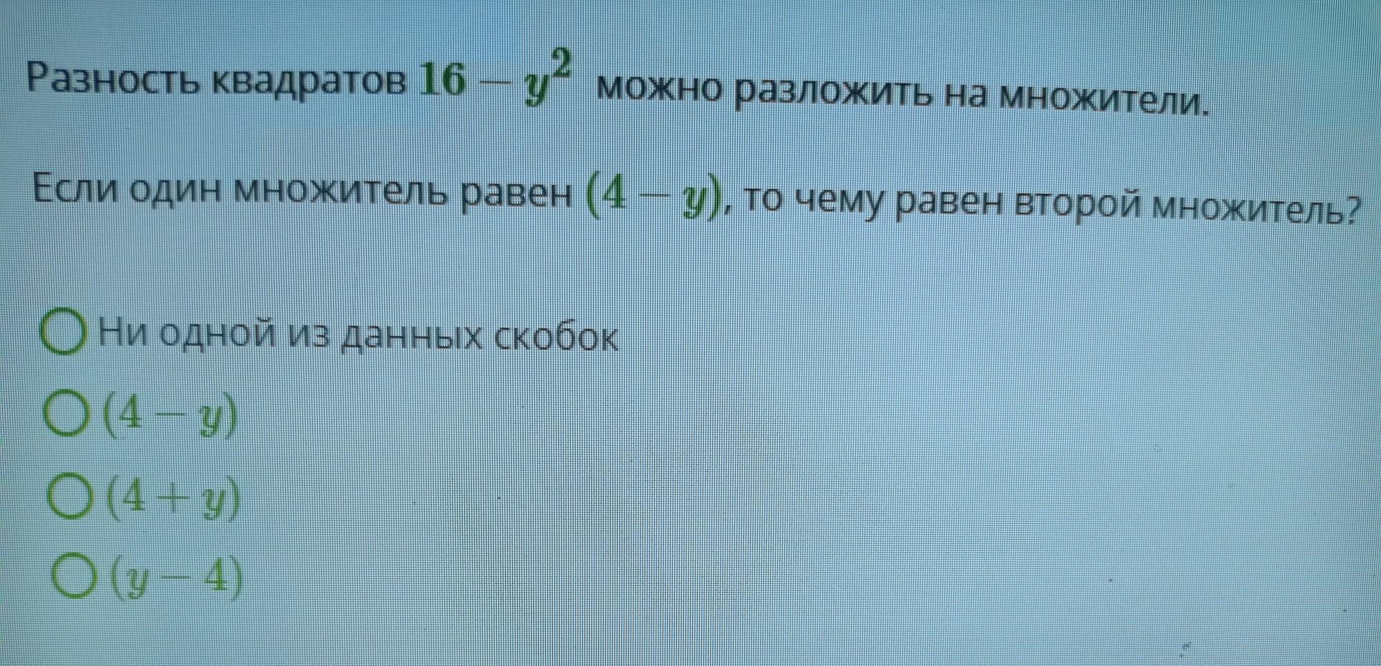 Разность квадратов 16 2 можно разложить на множители. у Если один множитель равен (4 — у), то чему равен второй множитель?