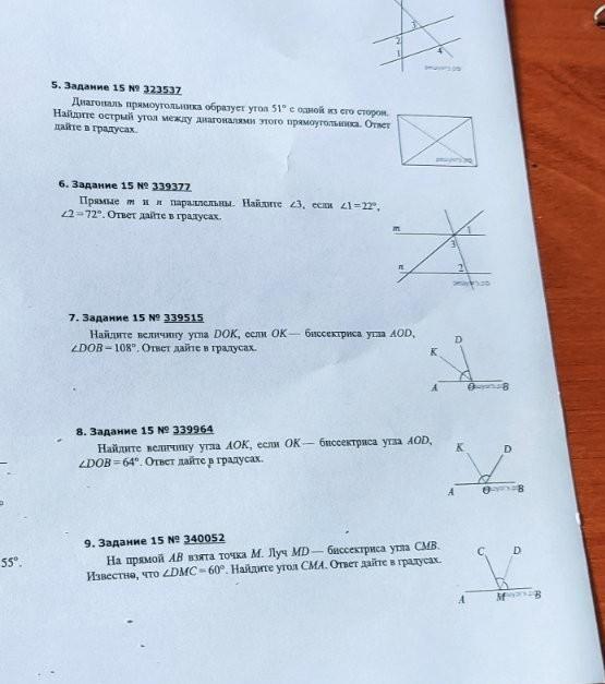 5. Диагонали прямоугольника точкой пересечения делятся пополам, поэтому треугольник ABO — равнобедренный, откуда получаем, что ∠ABO = ∠BAO = 51°. Сумма углов треугольника равна 180°, откуда ∠ BOA = 180° − 2 · 51° = 78°. Этот угол является острым углом между диагоналями прямоугольника. Ответ: 78°.
