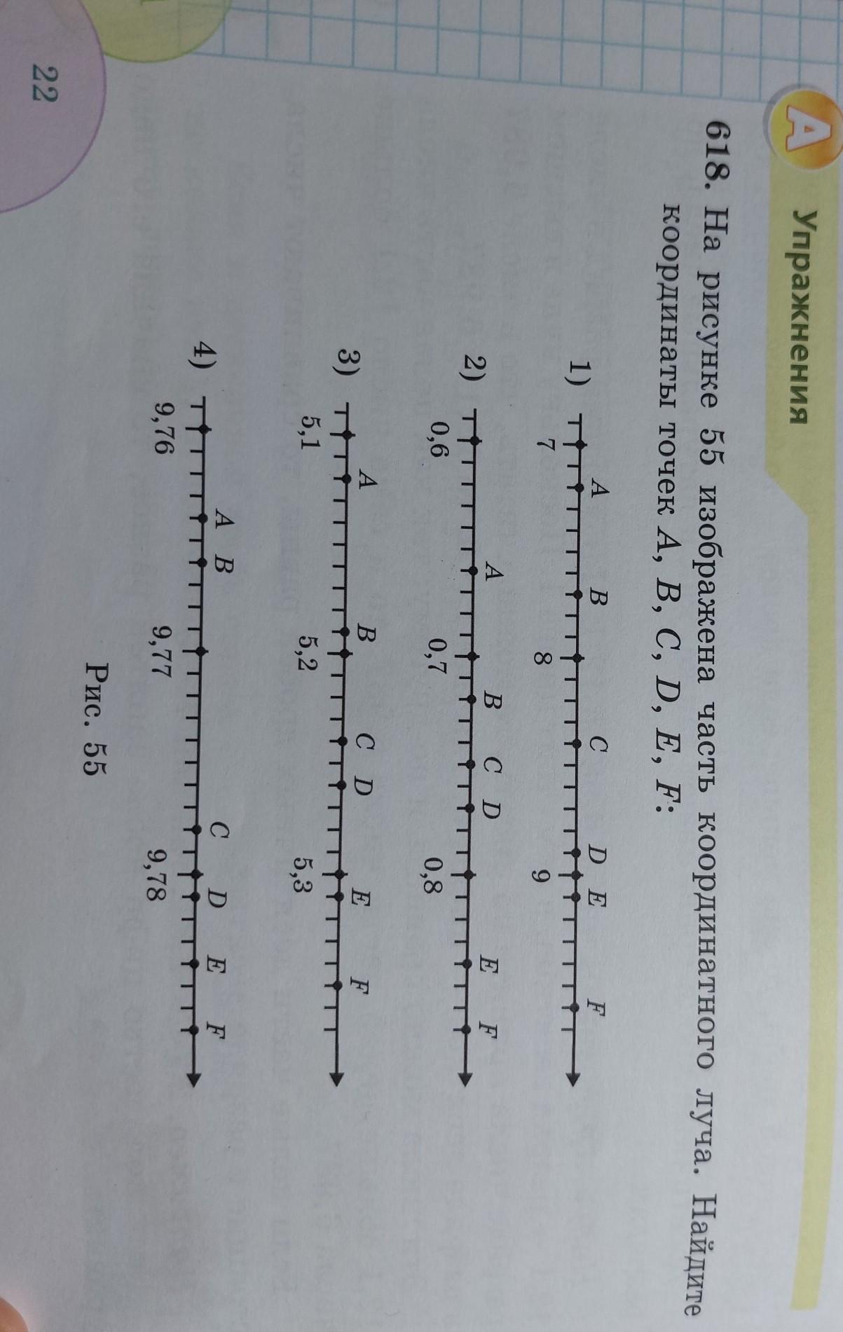A Упражнения 618. На рисунке 55 изображена часть координатного луча. Найдите координаты точек A, B, C, D, E, F: с D E F В А 1) тут 7 9 8 E F A B C D 2) 0,7 0,8 0,6 C D E F В A 3) т. 5,1 5.3 5,2 С D E F А В 4) ттт 9,76 9,77 9.78 пример 2