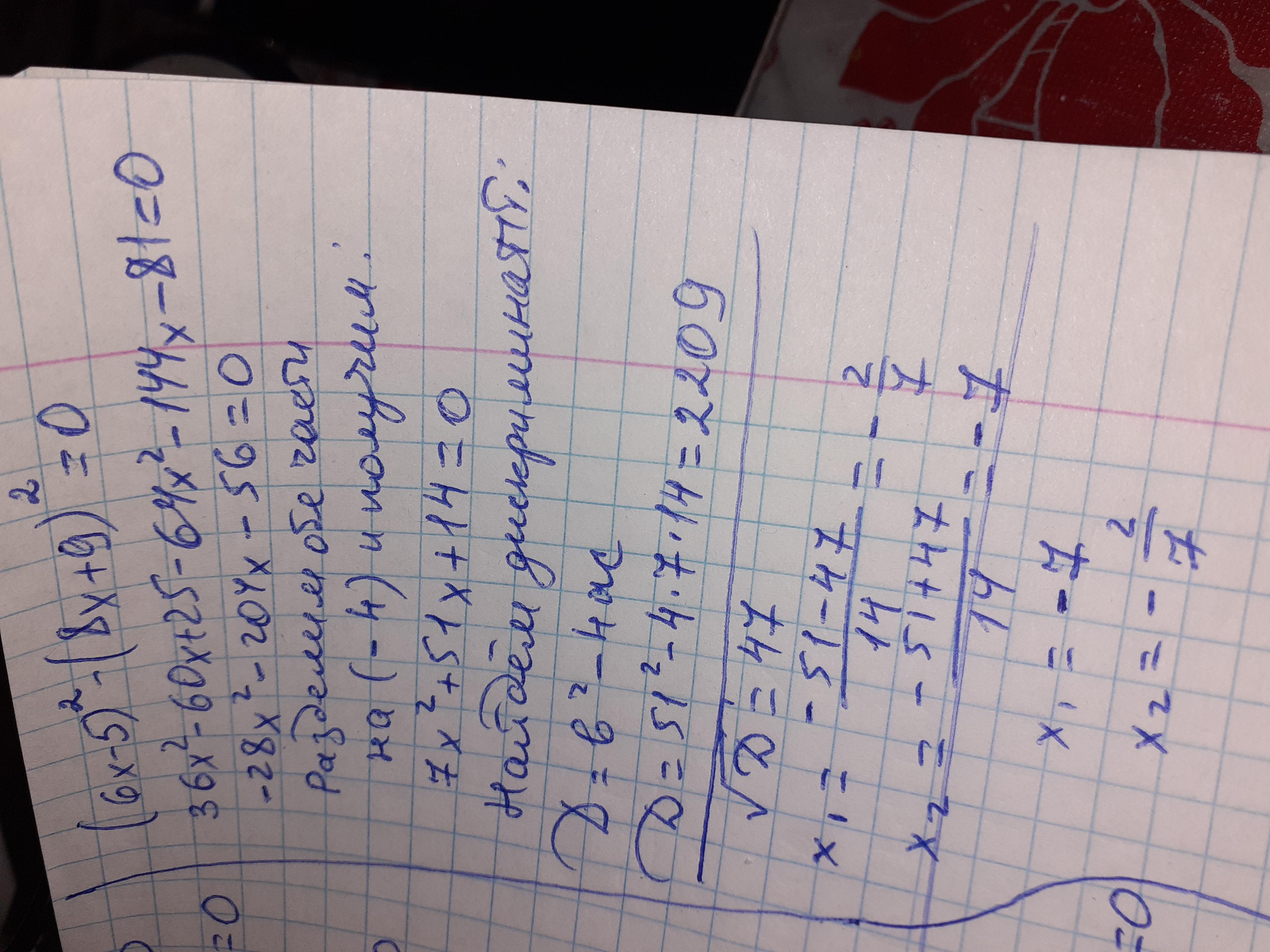 Розв'язати рівняння (6x-5)²-(8x+9)²=0