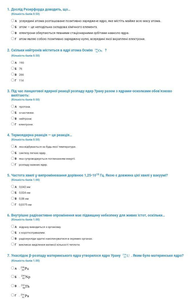 1а усередині атома розташоване позитивно заряджені ядро,яке містить майже всю масу атома 2 114 3 нейтрони 4 яка супроводжується поглинанням енергії 5 0,08нм 6 радіонукліди здатні накопичувати ся в органах 7 Pu