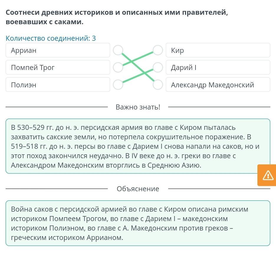 Соотнеси древних историков и описанных ими правителей, воевавших с саками. Количество соединений: 3 Арриан Кир Помпей Трог L, Дарий | Полиэн Александр Македонский
