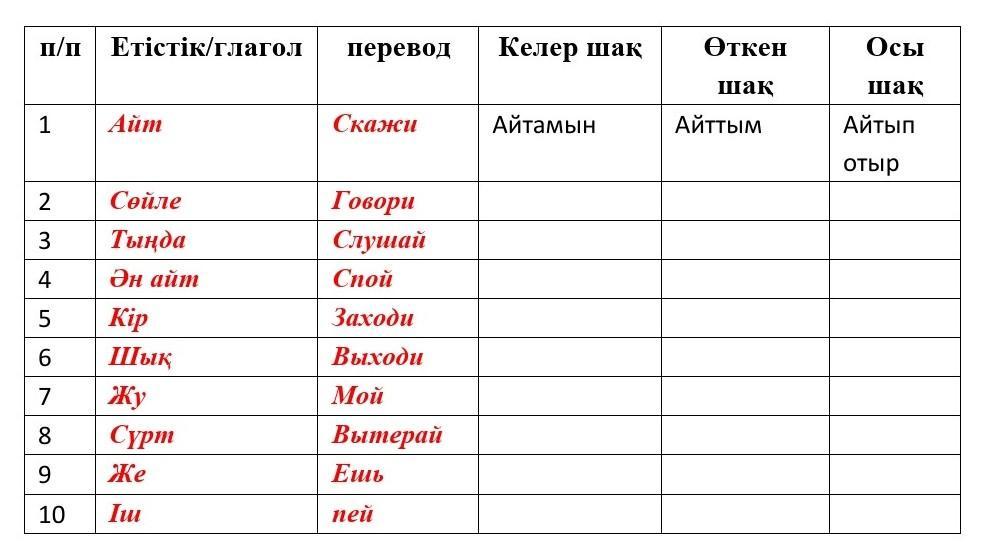 Осы шақ:Сөйлеп отыр,тыңдап отыр,ән айтып отыр,кіріп отыр,шығып отыр,жуып отыр,сүртіп отыр,жеп отыр,ішіп отыр.