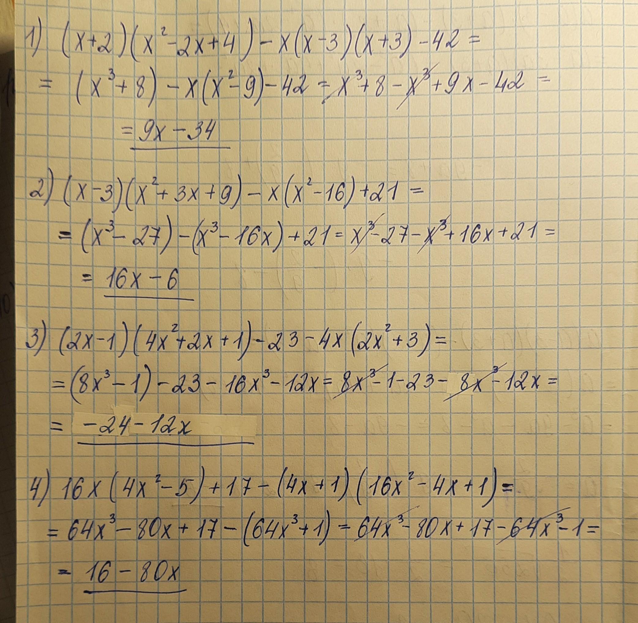 1) (x + 2)(x2 – 2x + 4) – x(x - 3)(x + 3) - 42;