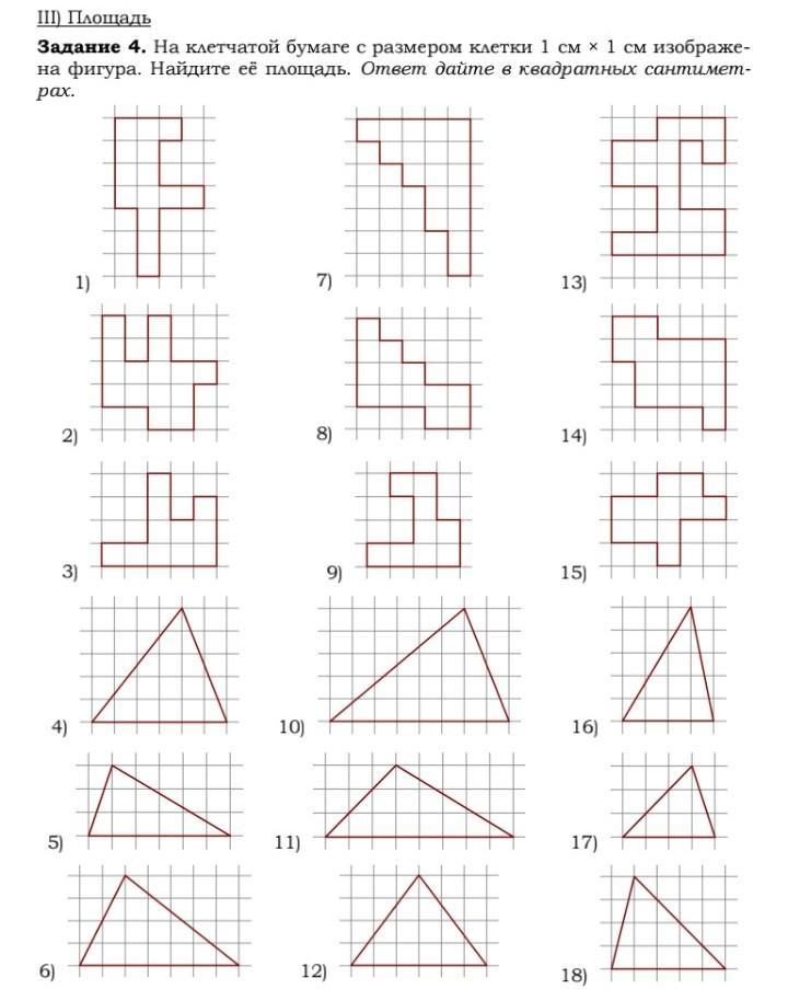 там все просто берешь и считаешь каждую клетку это 1см *1см,и треугольниках также только там половина клетки