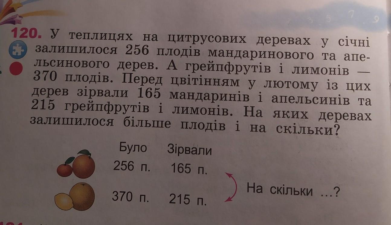 У теплицях на цитрусових деревах у січні залишилося 256 плодів мандаринового та апельсинового дерев. А грейпфрутів і лимонів — 370 плодів. Перед цвітінням у лютому із цих дерев зірвали 165 мандаринів і апельсинів та 215 грейпфрутів і лимонів. На яких деревах залишилося більше плодів і на скільки? Умову не надо
