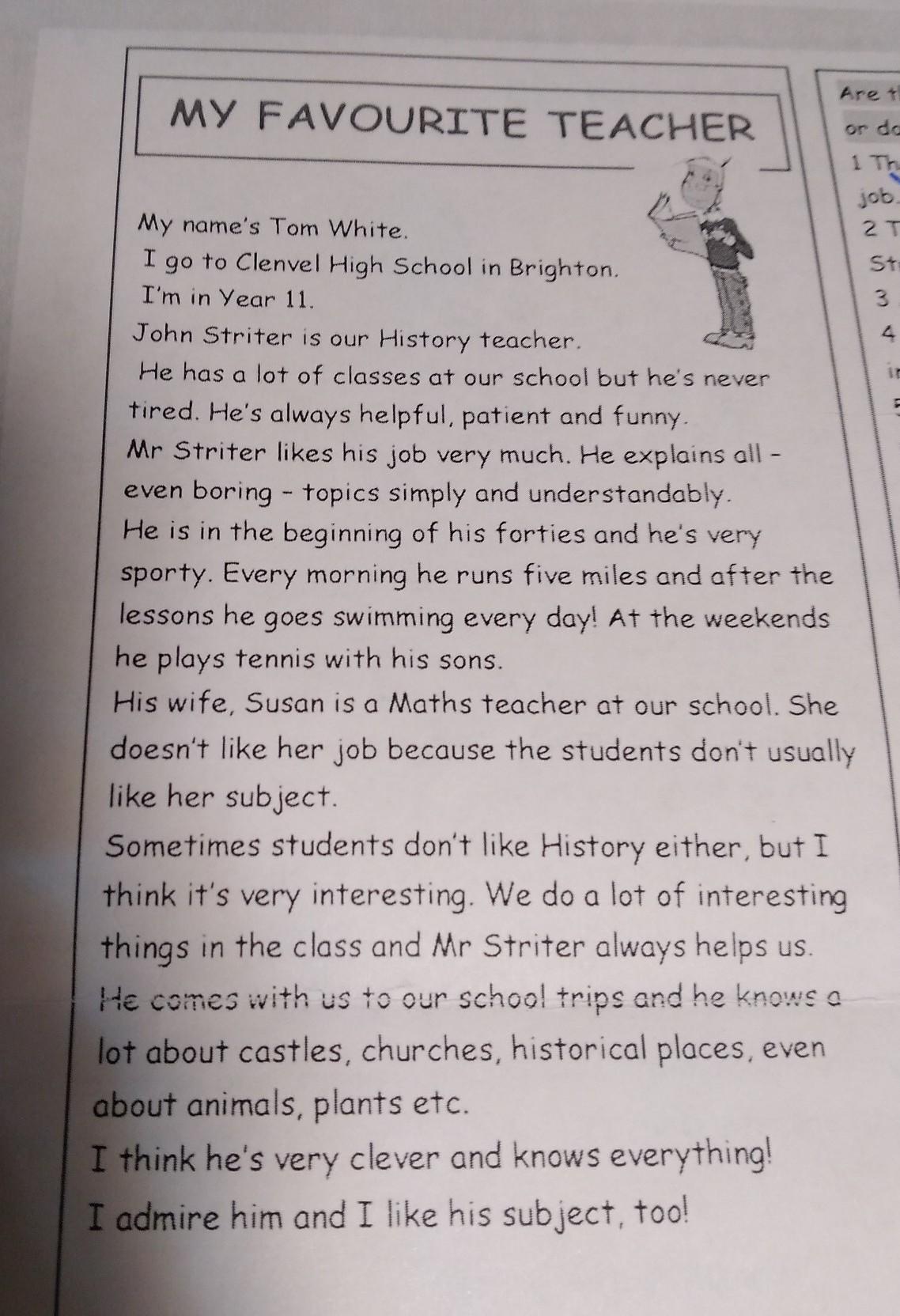 Ally Answer the questions. 1 How old is the History teacher? 2 Is he married? 3 What personality has he got? 4 Where does he go with Tom's class? 5 Why does Tom like him?
