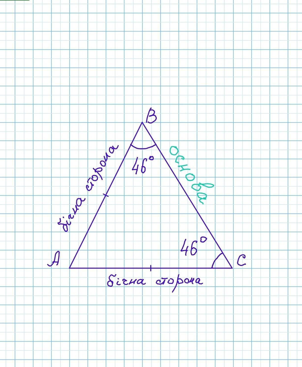 У рівнобедреному трикутнику ABC кут c дорівнює куту б дорівнює 46 градусів яка сторона є його основою