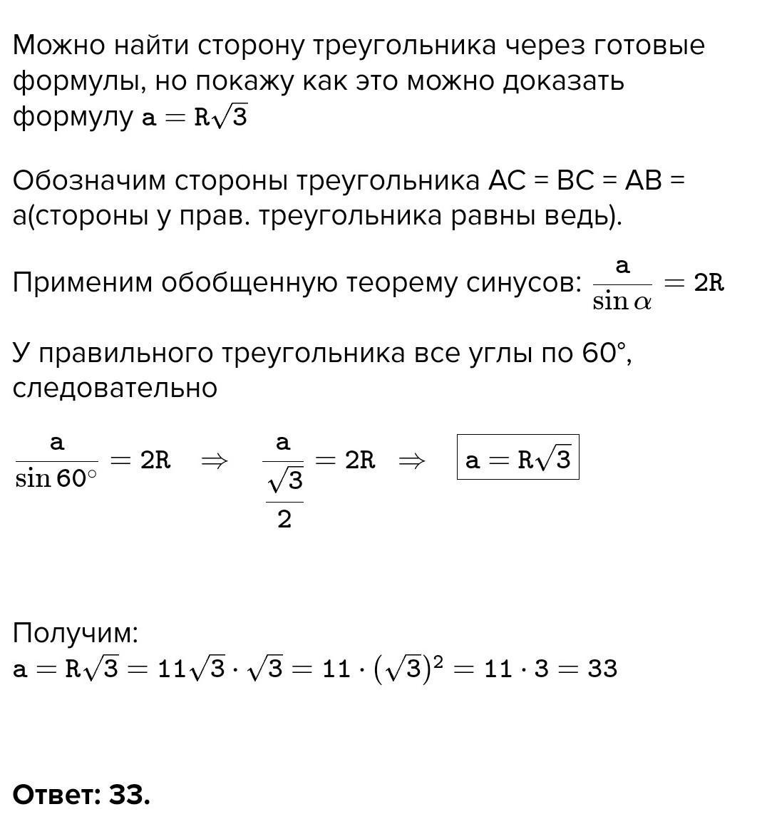 Радиус окружности, описанной около равностороннего треугольника, равен 11 корень из 3, найдите длину стороны этого треугольника.