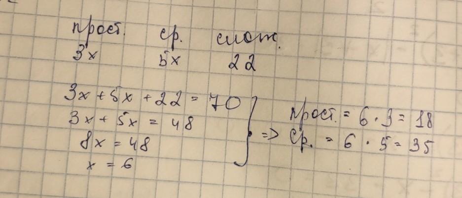 В подготовленных к олимпиаде тестах по математике вопросы делятся на простые, средней сложности и сложные. Количество простых вопросов относится к количеству средних как 3 : 5, а количество сложных заданий равно 22 . Сколько в тестах простых и средних по уровню заданий (по отдельности), если всего в тестах содержится 70 вопросов? ПЖЖЖЖЖЖЖ РЕШИТЕ СРОЧНО