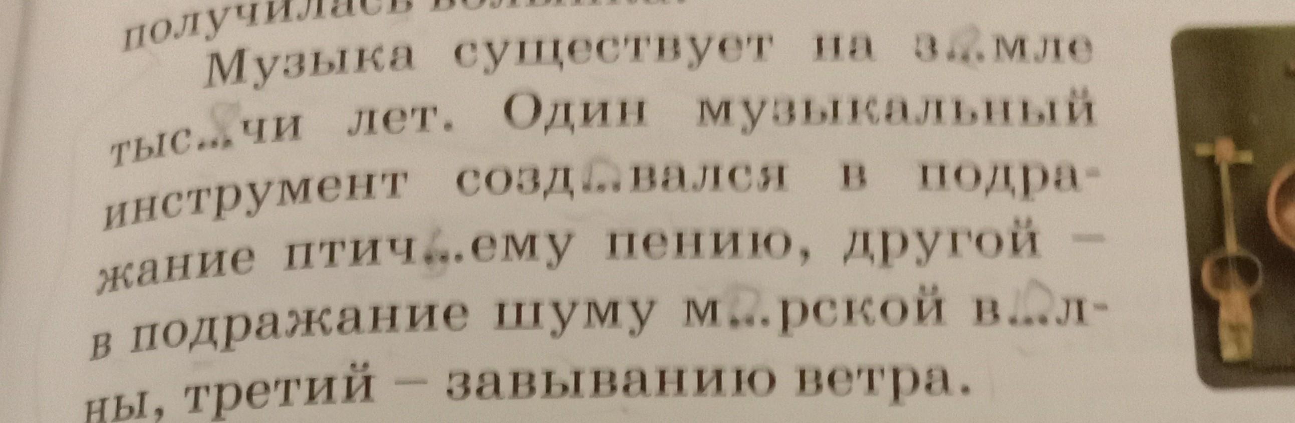 Музыка существует на земле тысячи лет . Один музыкальный инструмент создавался в подражание птичьему пению,другой в подражание шуму морской волны, третий - завыванию ветра.