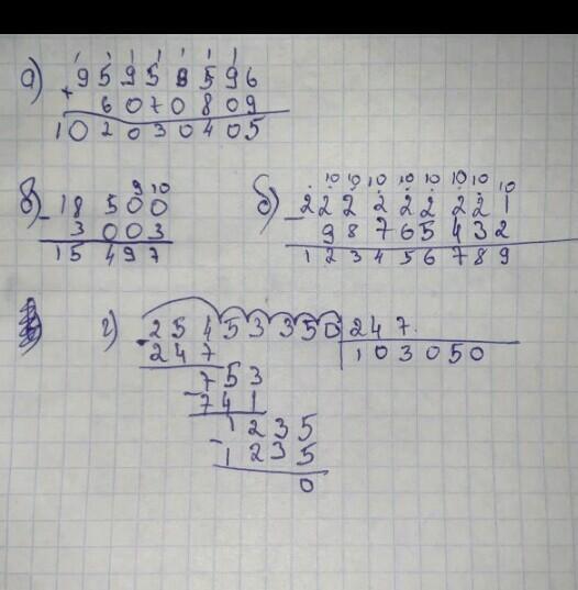 Выполни действия с комментарием и сделай проверку: a) 95 959 596 + 6 070 809; B) 18 500 - 3003; 6) 222 222 221 98 765 432; r) 25 453 350 : 247. пж помогите