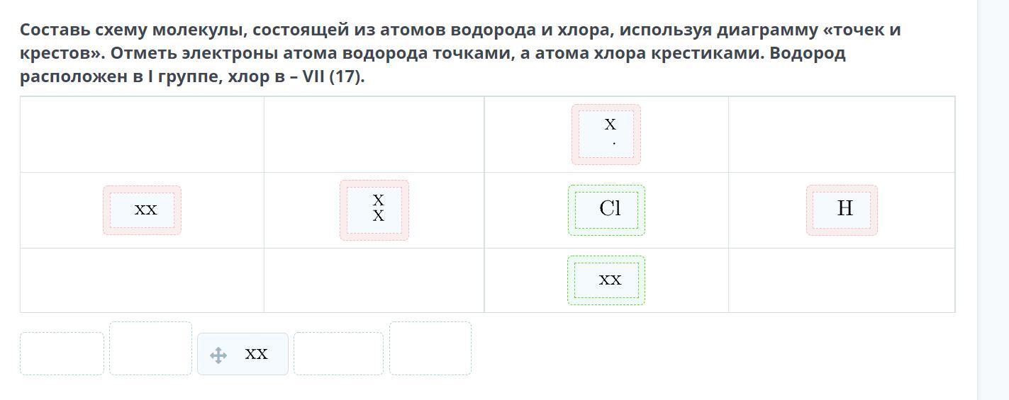 СРОООООЧНООО!!!!Составь схему молекулы, состоящей из атомов водорода и хлора, используя диаграмму «точек и крестов». Отметь электроны атома водорода точками, а атома хлора крестиками. Водород расположен в I группе, хлор в - VII (17).