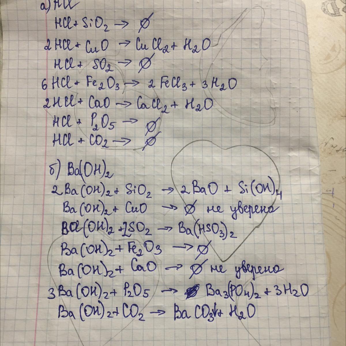 какими из перечисленных оксидов будет реагировать: а) соляная кислота, б) барий гидроксид: SiO2, CuO, S02, Fe2O3, CaO, P205, CO2? Написать уравнения возможных реакций.