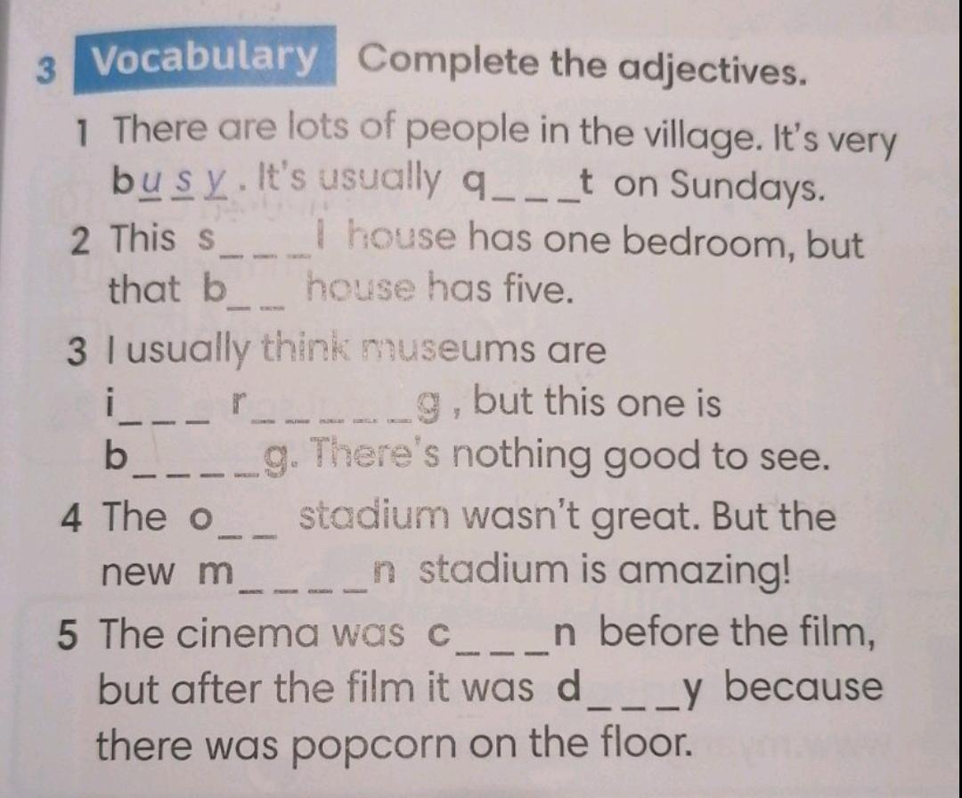 Complete the adjectives. 1 There are lots of people in the village. It's very busy. It's usually q_-_t on Sundays