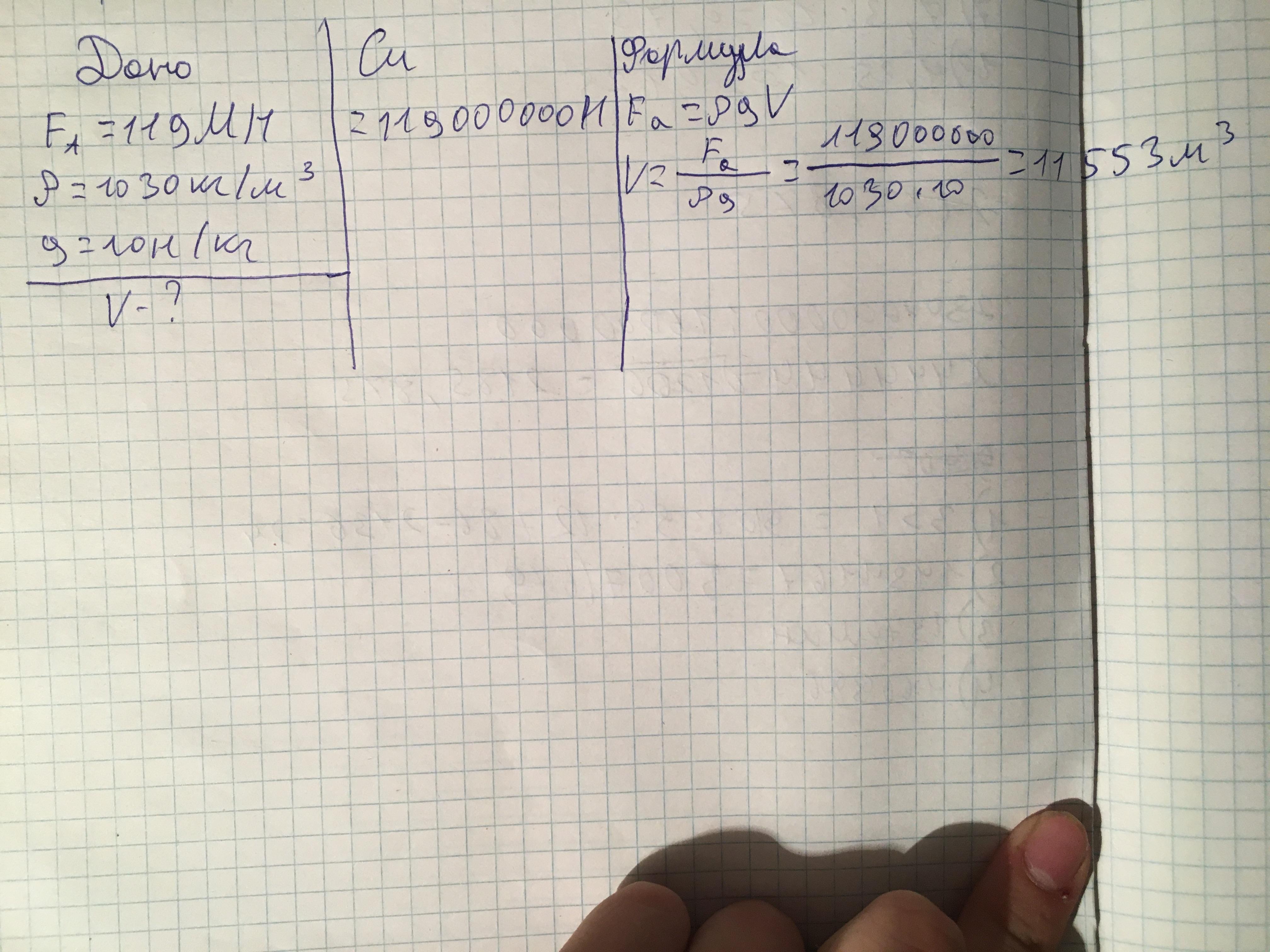 V=Fa/(ρg)=119000000/(1030*10)=11553м³