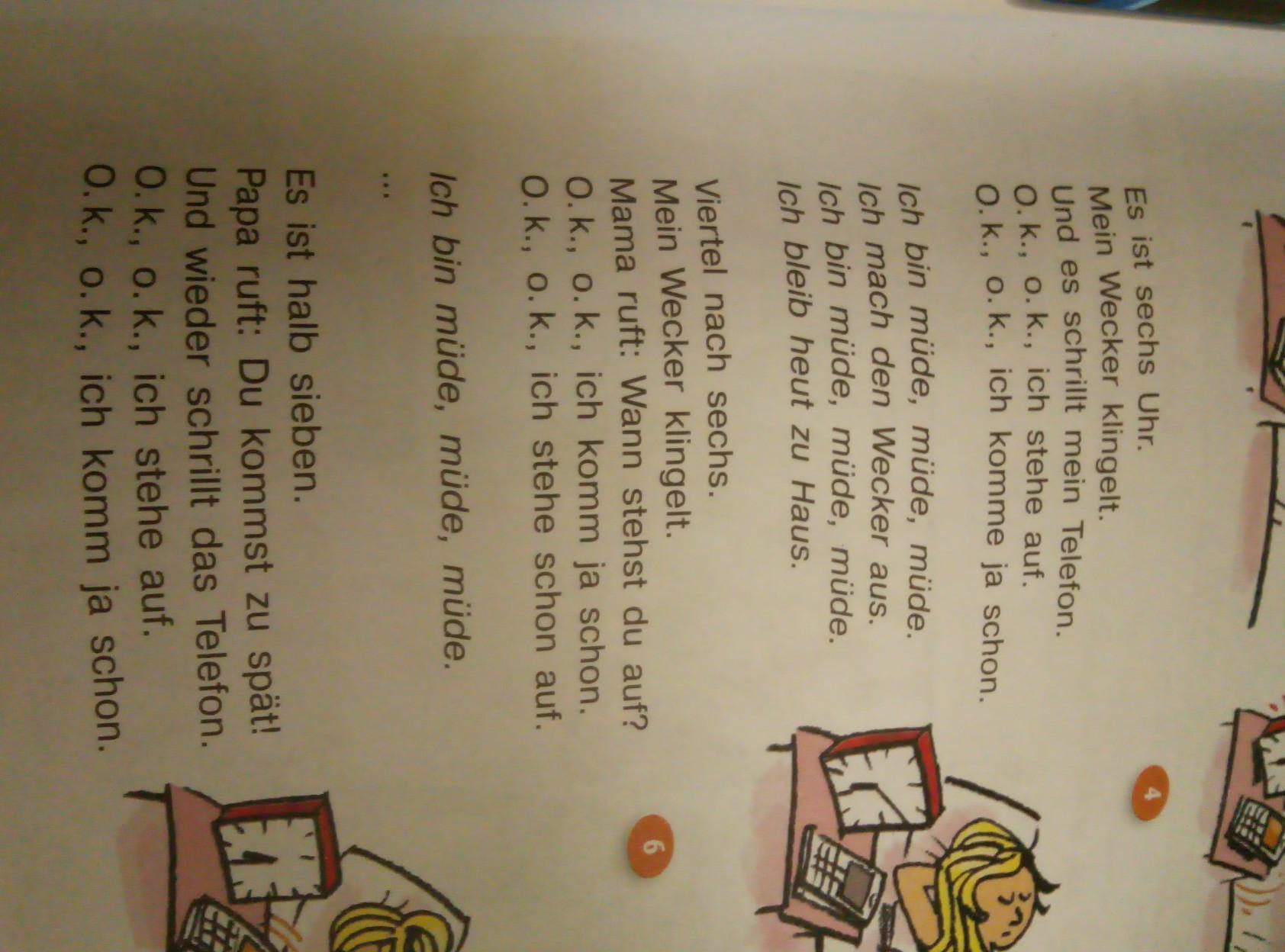Эс ист зехс ур. Майн Векер клингелт. Окей окей их штее ауф. Окей окей их комме я шон. Их бин мюде мюде мюде. Их мах дэн вэкер аус. Их бин мюде мюде мюде. Их бляйб хойт цу хаус. Фиртел нах зехс. Майн Векер клингелт. Мама руфт ван штест ду ауф. Окей окей их комме я шон. Окей окей их штее шон ауф. Их бин мюде мюде мюде. Ес ист халб зибен. Папа руфт ду коммст цу шпет. Унд видер шрильт даз телефон. Окей окей их штее ауф. Окей окей их комме я шон.
