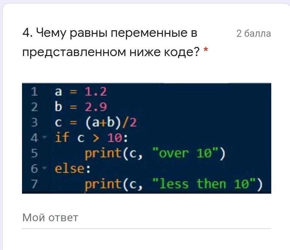 4. Чему равны переменные в представленном ниже коде? * 2 балла 1 a = 1.2 2 b = 2.9 3 c = (a + b) / 2 4 ifc > 16 : 5 6 - else: 7 print(c , "less then 10^ prime prime Мой ответ print (c, "over 10")