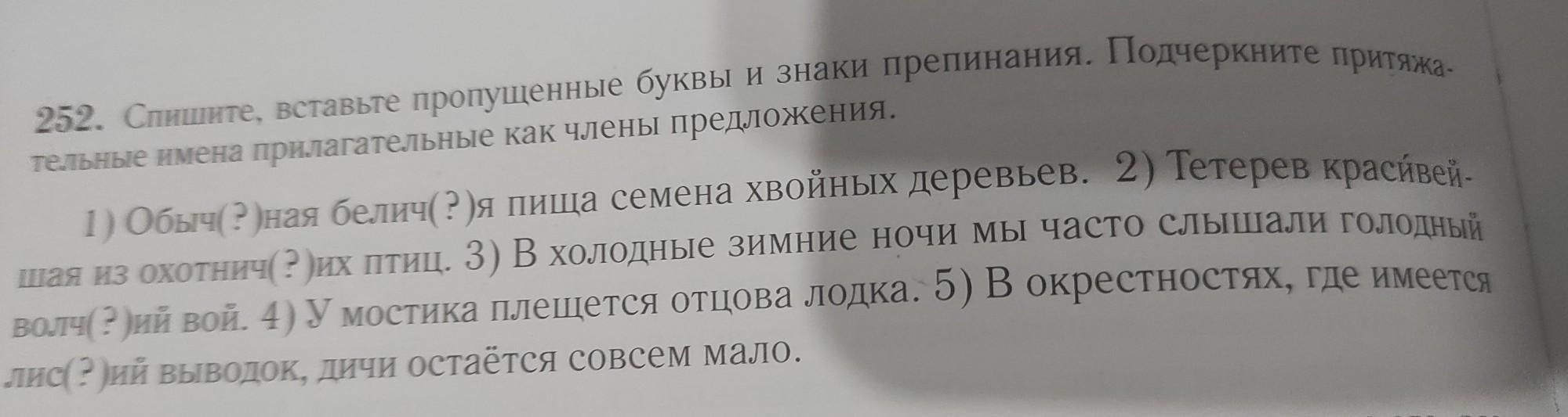 252. Спишите, вставьте пропущенные буквы и знаки препинания. Подчеркните притяжательные имена прилагательные как члены предложения.