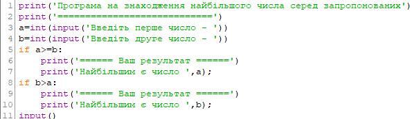 Складемо програму мовою Python, якій із двох введених цілих чисел А і В виводиться найбільше із них. Для початку нам потрібно отримати числа, далі порівняти одне з одним. Якщо А буде більше чи рівне В, тоді результат А нас влаштує. Якщо ні тоді ми перевіримо чи В більше А і результат виведемо.